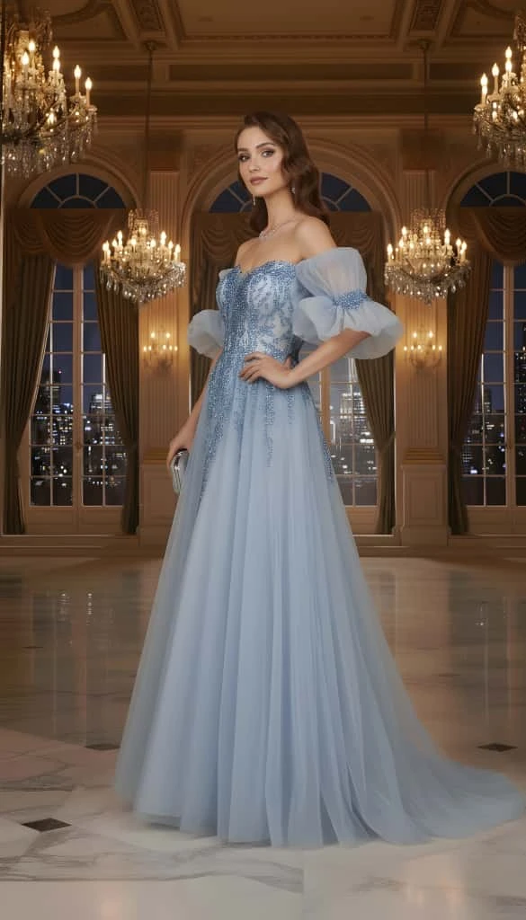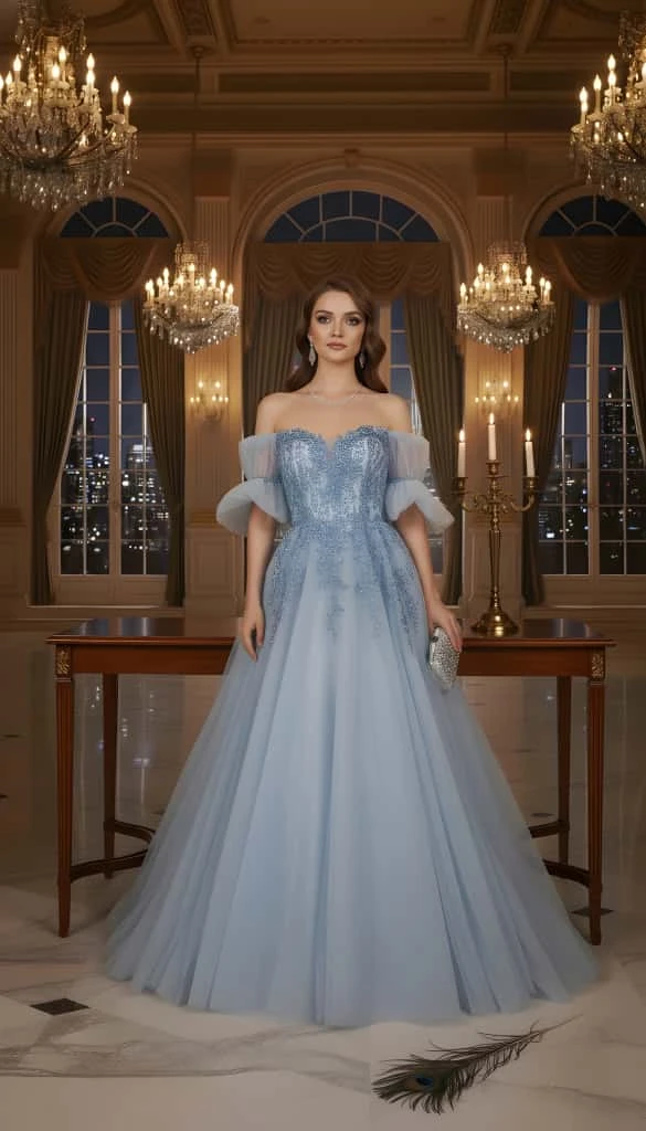 💙 سحر الغيوم في فستان! ☁️ إطلالة ملكية ناعمة تحاكي أميرات القصص الخيالية، بلون سماوي حالم وتفاصيل دقيقة. الموديل: فستان سهرة بقصة أميرة (Ball Gown) مع تفاصيل عصرية ساحرة. المديل: يتميز بـياقة على شكل قلب (Sweetheart) مع تصميم Off-Shoulder (أكمام منسدلة عن الأكتاف) منتفخة بخفة من التول الشفاف، مما يضفي لمسة رومانسية وجريئة في آن واحد. القماش والتفاصيل: الجزء العلوي: صدرية شفافة (Corset-style) مزينة بتطريزات نباتية أنيقة بلون أزرق داكن، مما يبرز تفاصيلها الراقية. التنورة: طبقات من التول الخفيف والناعم بلون أزرق فاتح (Dusty Blue)، مع لمعة خفيفة تظهر عند الحركة، لمنحكِ إطلالة أثيرية لا تُنسى. اقتني قطعة فنية تحكي عن الأناقة والرقة. |