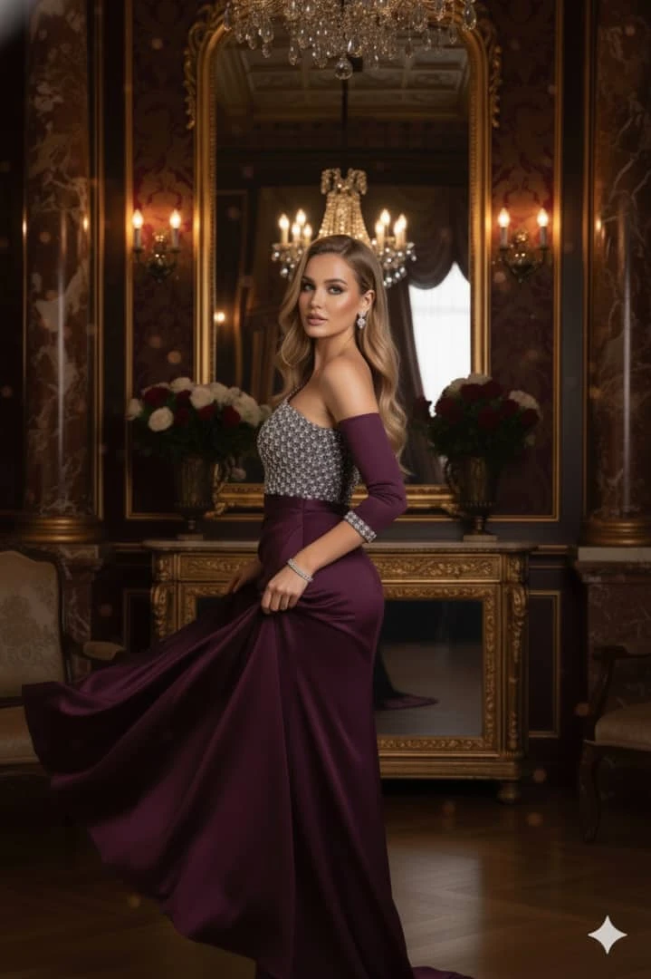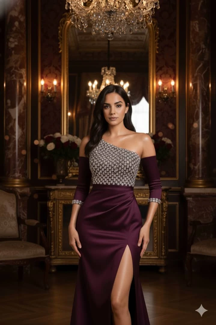 تألقي بفخامة اللون العنابي! 🥂 فستان سهرة يجمع بين الجرأة واللمعان الراقي، لإطلالة لا يمكن نسيانها. اللون والموديل: فستان سهرة بلون العنابي الداكن (Burgundy/Plum)، بقصة One-Shoulder (كتف واحد) تبرز الأناقة بأسلوب مميز. التفاصيل والأقمشة: الجزء العلوي (الصدرية): مطرزة بالكامل بـأحجار لامعة وكريستالية كثيفة بتوزيع أنيق يغطي الكتف والصدر، مما يمنحها بريقًا مبهرًا. الأكمام: أكمام طويلة مرفقة (أو قابلة للفصل) بطول ثلاثة أرباع، تنتهي بتفاصيل كريستالية متطابقة مع الصدرية. التنورة: مصنوعة من قماش الساتان السميك واللامع، وتتميز بقصة ضيقة (Sheath/Fitted) مع شق جانبي عالٍ (High Slit) وتكسيرات أنيقة تزيد من جاذبية القوام. أضيفي لمسة الدراما والبريق إلى سهراتك! |