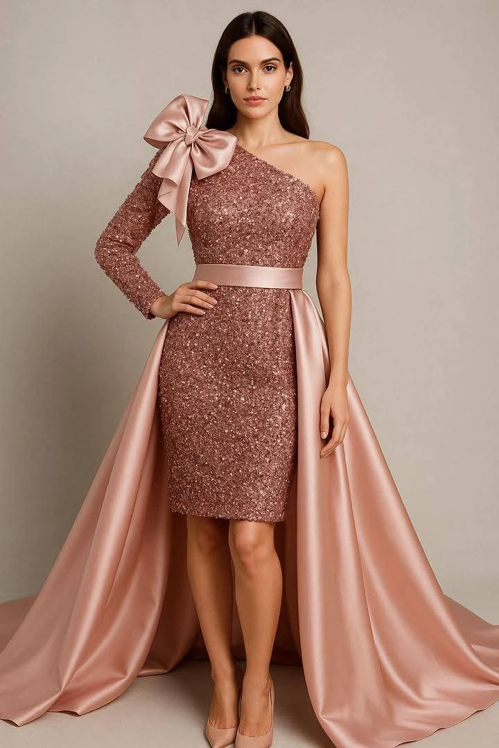 🎀 لمعان لا يقاوم بلمسة عصرية! ✨ فستان سهرة قصير بلمسة درامية ساحرة، مثالي للسيدة التي تبحث عن إطلالة جريئة وعصرية. اللون والقماش: بلون "الزهري الترابي" أو "الوردي المائل للبني" (Dusty Rose/Mauve). الفستان الأساسي: مغطى بالكامل بـالترتر اللامع (Sequins) ليمنحه بريقًا كثيفًا وجذابًا. الذيل والإكسسوار: مصنوع من قماش الساتان الفاخر بلون مطابق. الموديل والتفاصيل: التصميم: يتميز بقصة One-Shoulder (كتف واحد) مع كم طويل ضيق. الحجم: فستان قصير (Mini-Dress) ضيق على الجسم. اللمسة الدرامية: مزود بـذيل خلفي طويل (Overskirt/Train) قابل للفصل، مع فيونكة كبيرة (Oversized Bow) بارزة على الكتف، مما يضيف فخامة غير تقليدية. تصميم يجمع بين جرأة القصير وفخامة الذيل الطويل! |