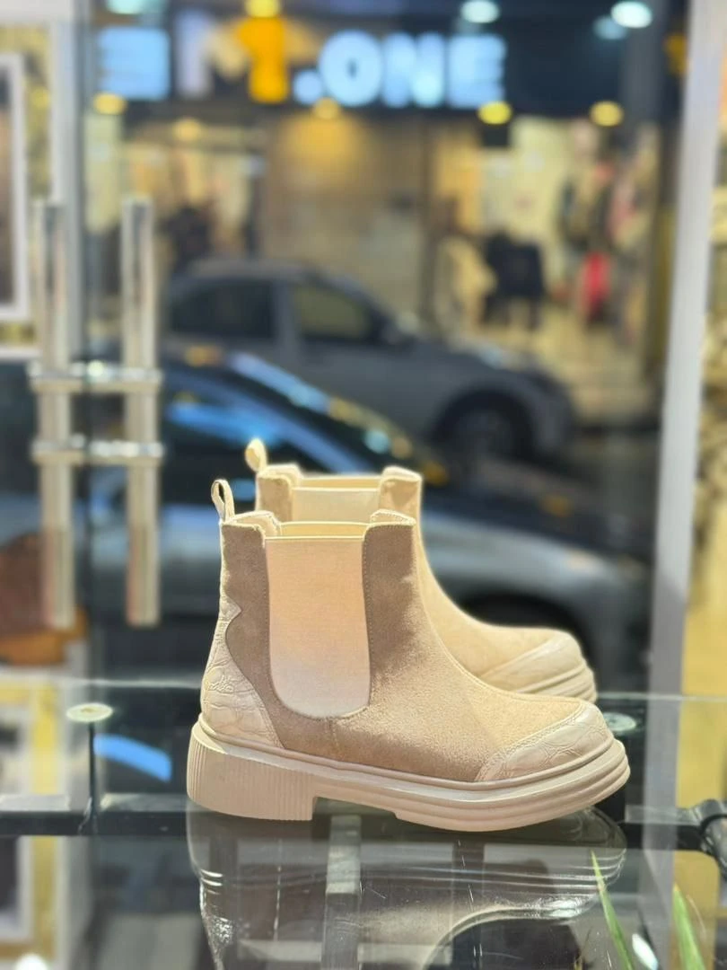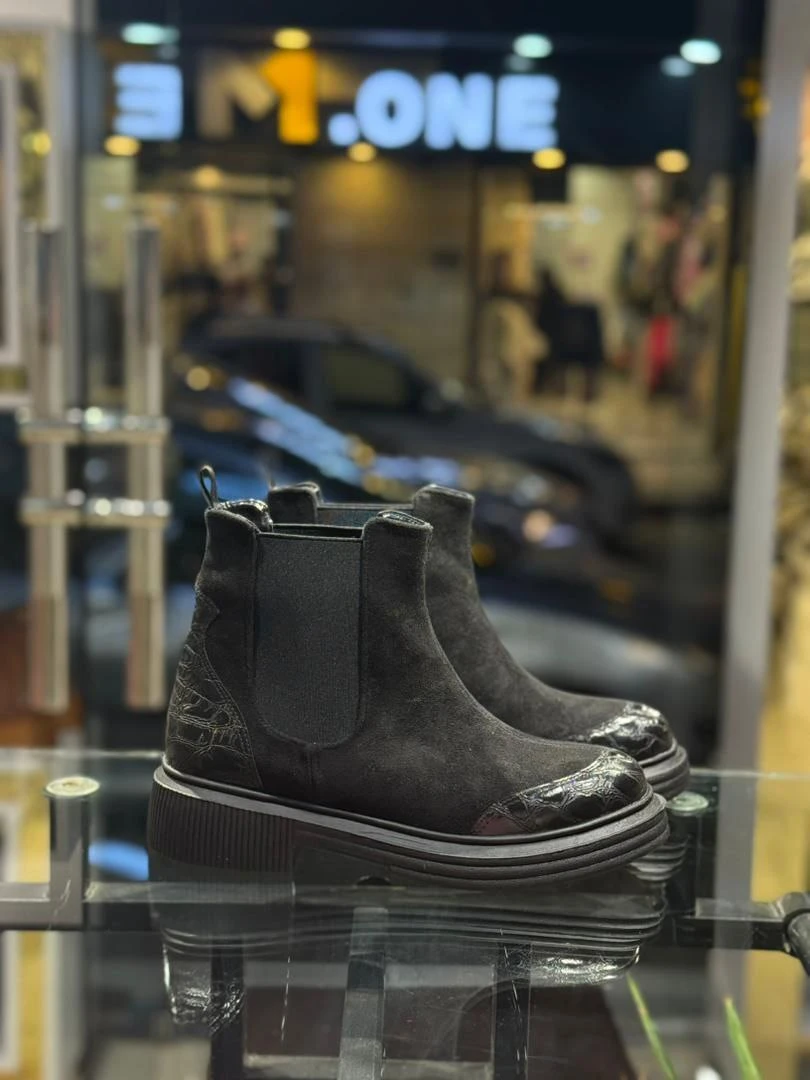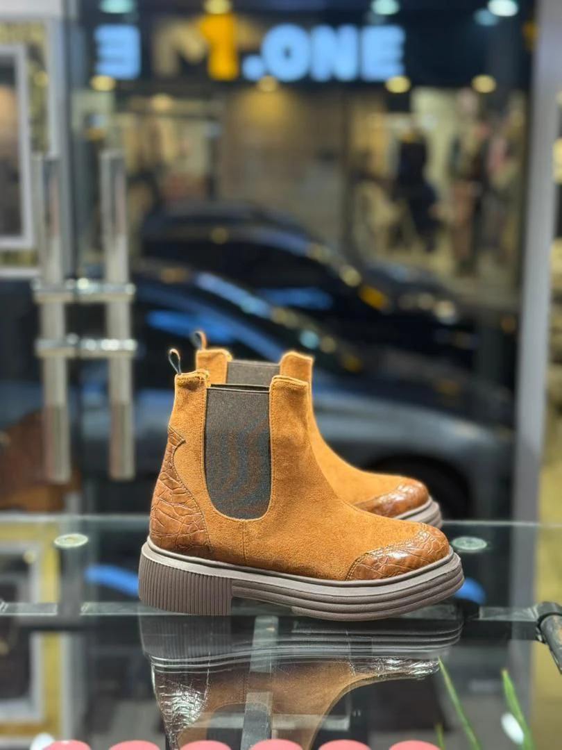 تصميم أنيق: تتميز الجزمة بتصميم عصري يجمع بين قماش الشامواه الفاخر والجلد المتين، مما يجعلها مثالية لإطلالاتك اليومية أو المناسبات الخاصة.