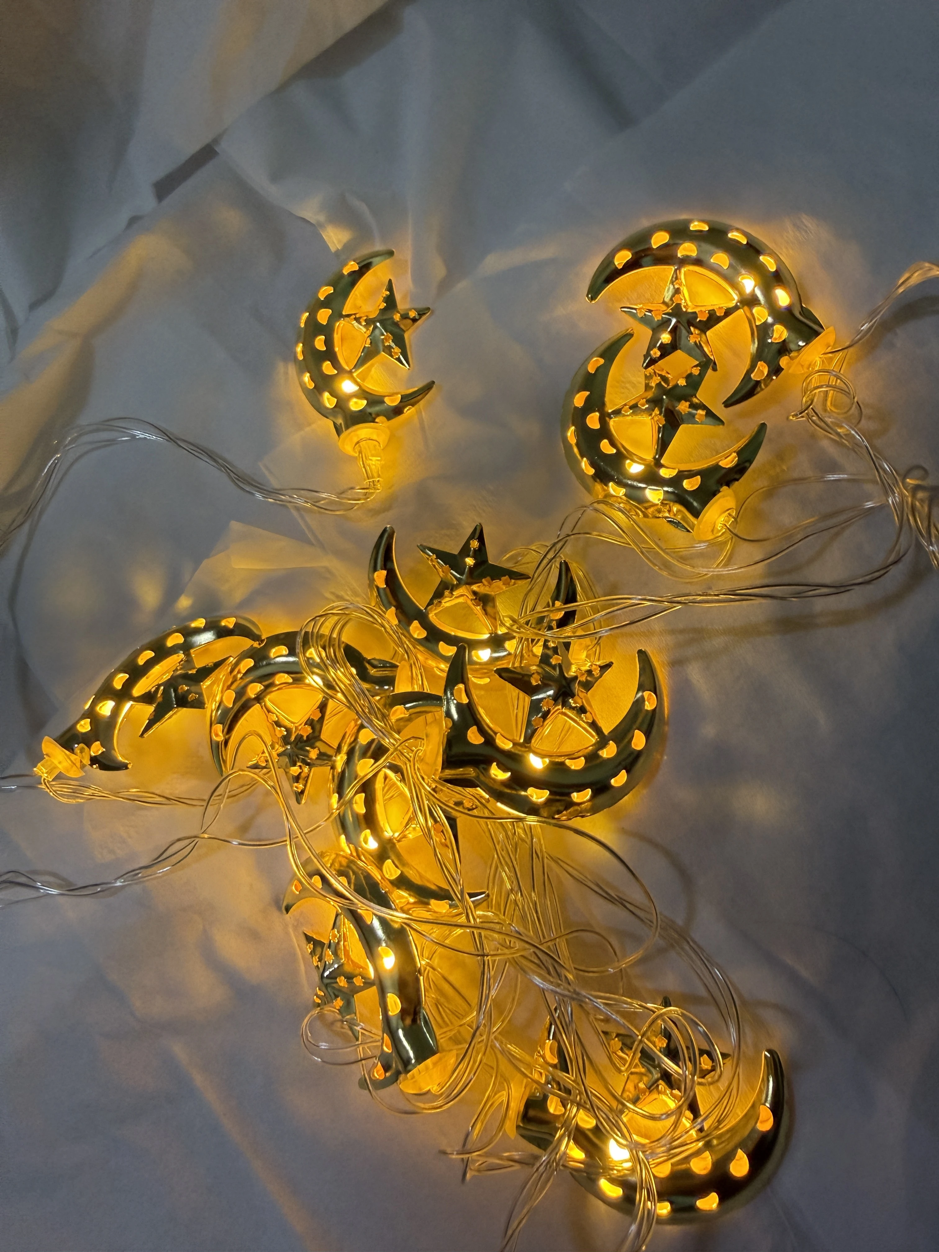 تصميم فريد: يتميز الحبل الضوئي بأشكال رمضانية متنوعة مثل الهلال والنجوم، مما يضفي لمسة جمالية وروحانية على الديكور.