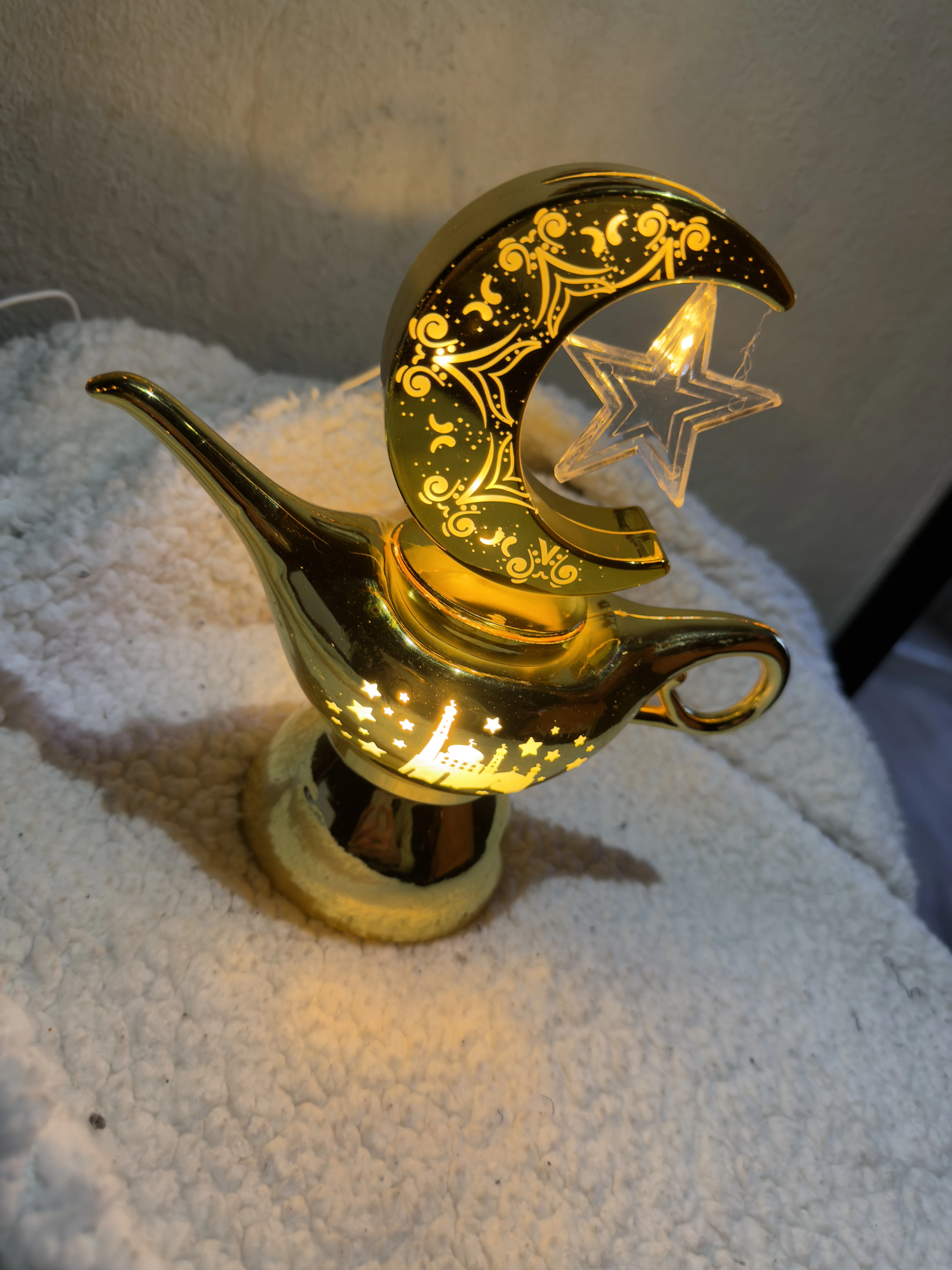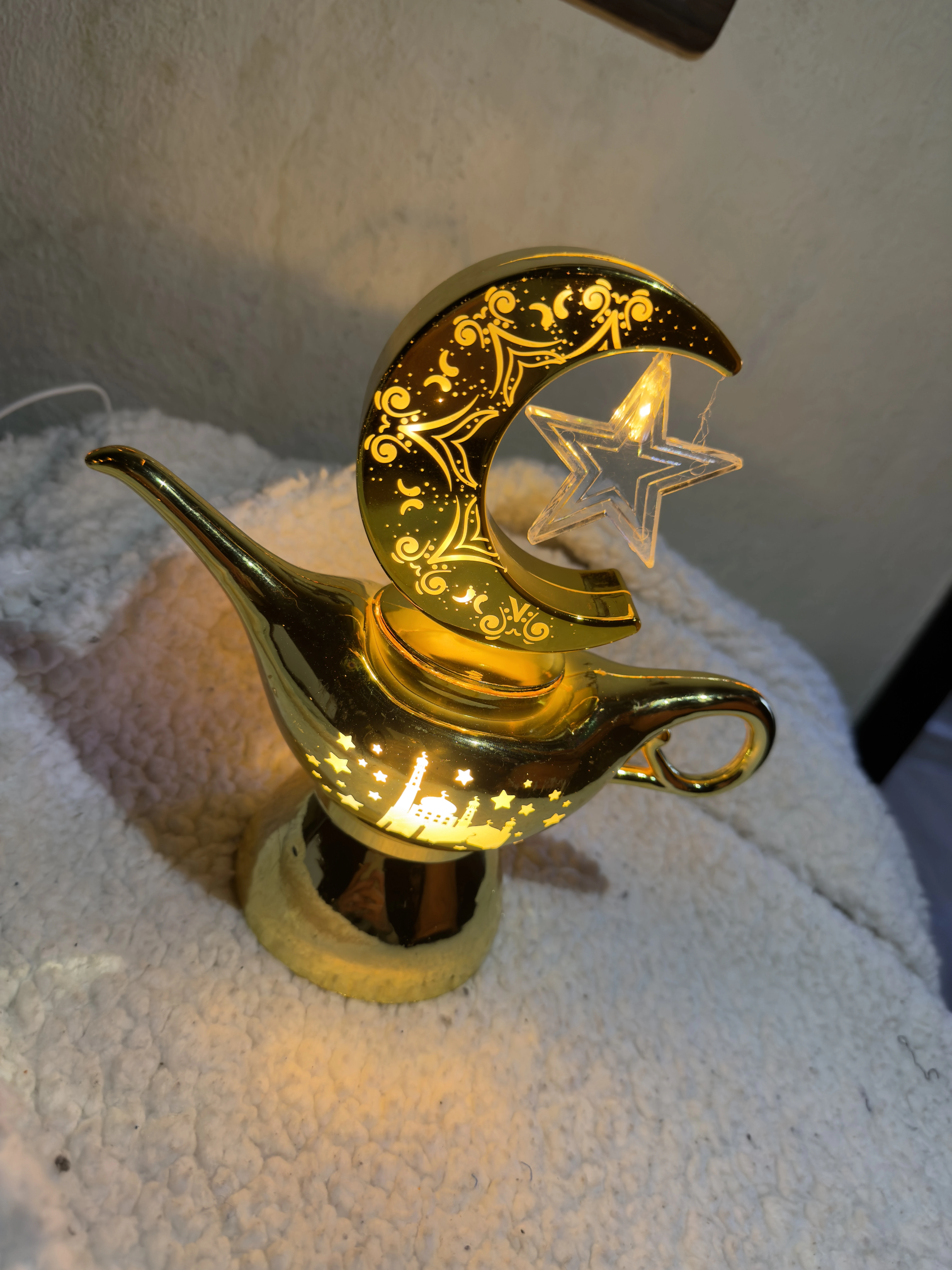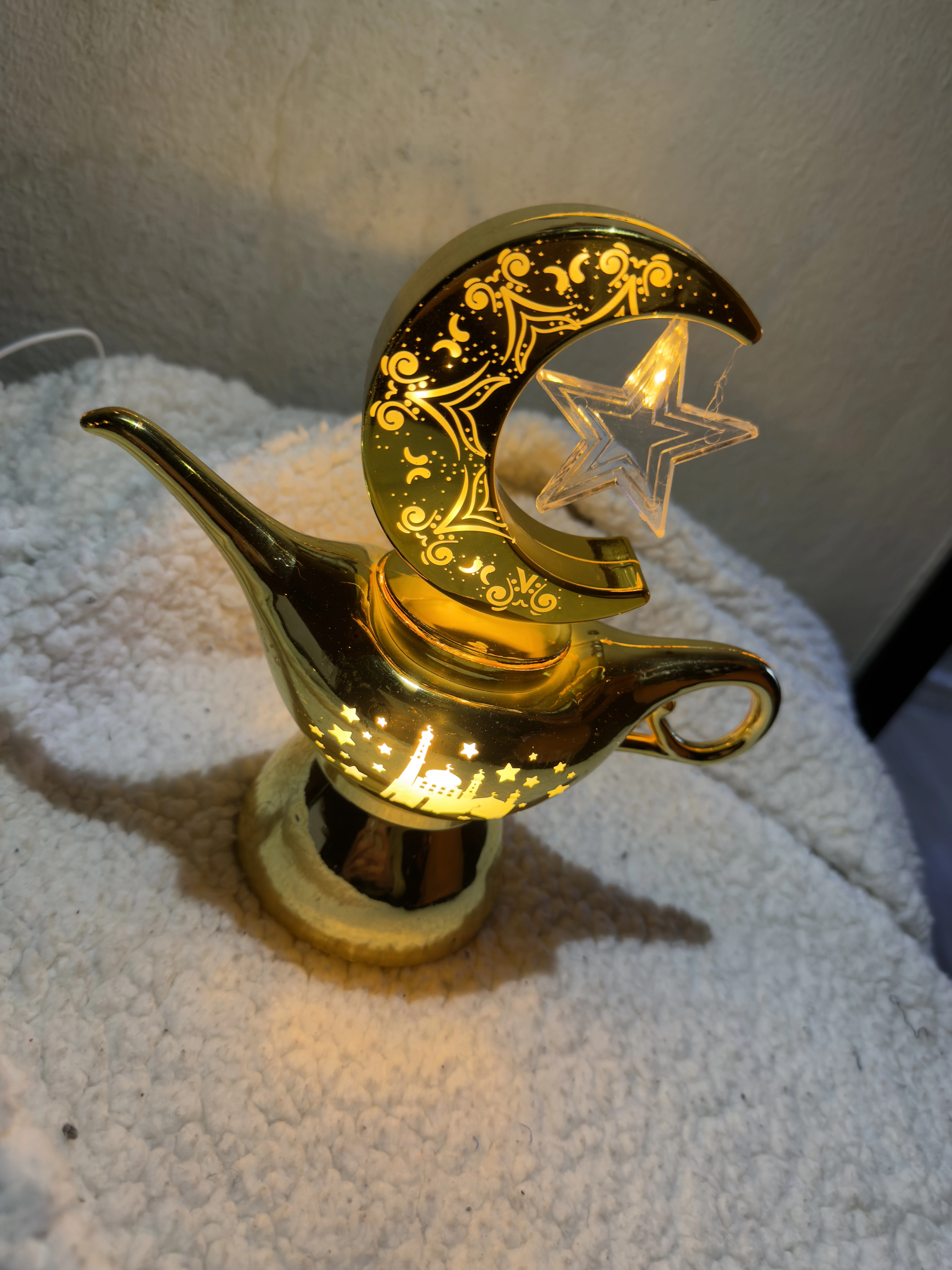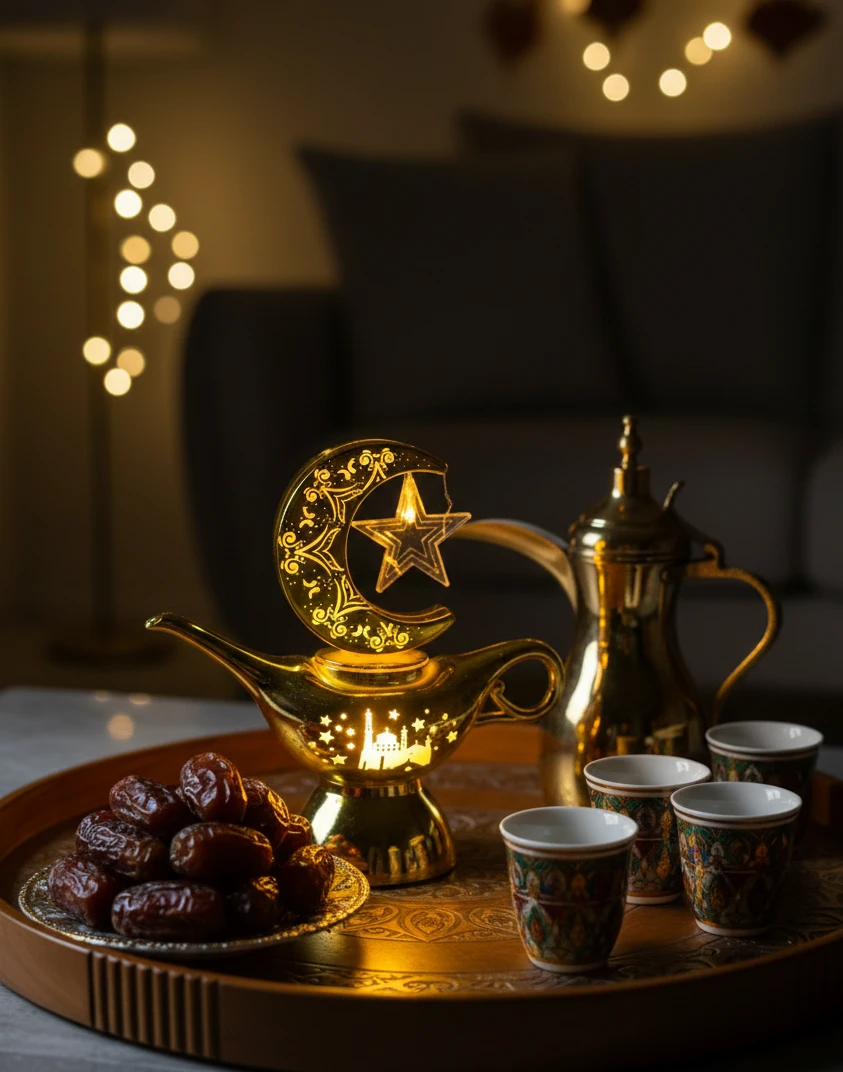 إضاءة ساحرة: يحتوي المجسم على إضاءة داخلية تضفي جوًا دافئًا ومريحًا، مما يجعله مثاليًا للاستخدام في المساء أو أثناء السهرات الرمضانية.