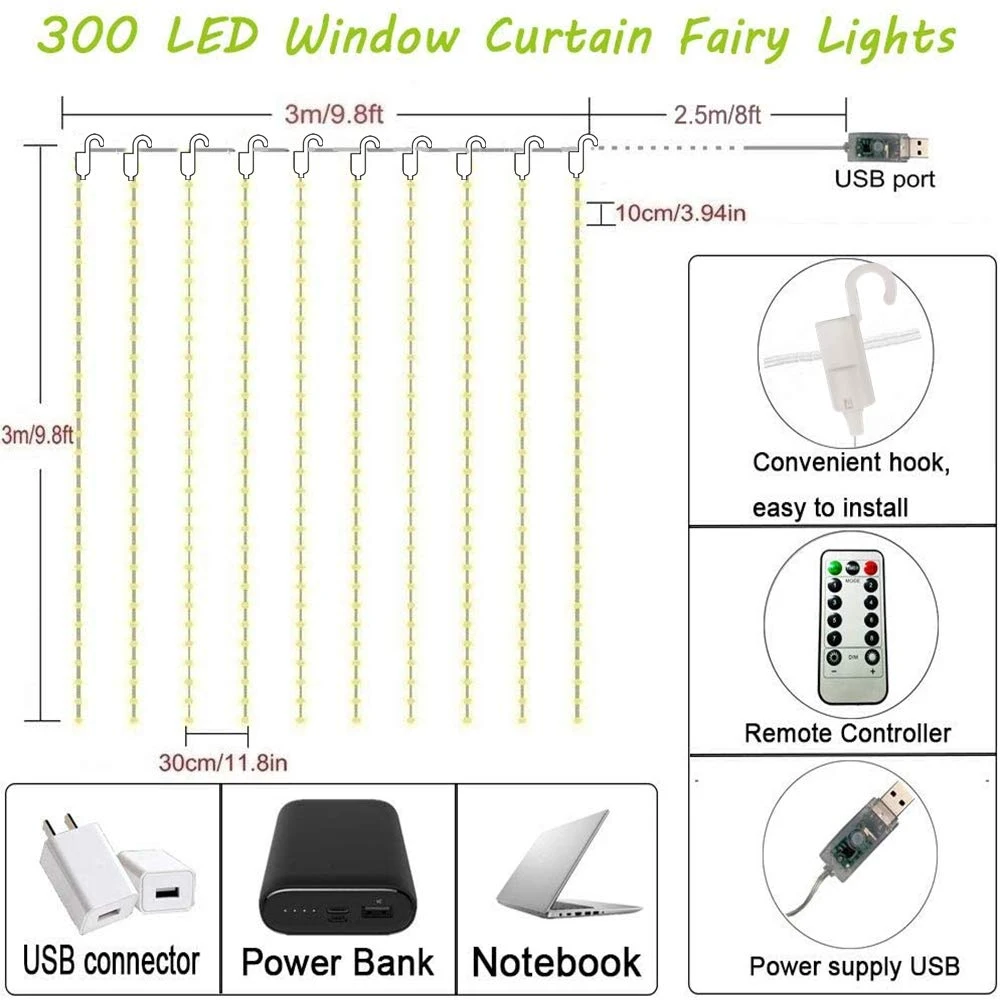 【مصابيح ستارة LED USB مطورة】تم تصميم سلسلة مصابيح ستارة النافذة بـ 300 مصباح LED بمنفذ USB. يوفر اتصال يو اس بي الكثير من الاحتمالات، يعمل عبر منفذ USB. مفتاح تشغيل/إيقاف: قم بتشغيل وإيقاف الأضواء بدون جهاز التحكم عن بعد بالضغط على الزر الموجود على USB. سهلة ومريحة لك للاستخدام مع باور بانك المحمول، مصابيح الستائر الخيالية المعلقة المستخدمة في أي مكان تقريبًا، مثل غرفة النوم وحفلات الزفاف والأنشطة الخارجية والحفلات والحديقة والفناء وما إلى ذلك. 【إضاءة ستارة رائعة متعددة الألوان】- تتوهج بألوان متعددة، سيكون هذا المصباح الخيالي هو أجمل وأروع مصابيح ستارة ثلجية يمكنك العثور عليها. أفضل إضاءة ديكور لغرفة النوم أو غرفة الفتيات أو غرفة المعيشة أو الشرفة أو المسكن أو الحفلات أو أعياد الميلاد أو أي مناسبات ذات طابع خاص وما رائع للغاية بغض النظر عن الحائط الفارغ أو النافذة أو خلف الستارة الشفافة. ملاحظة: شريط مصابيح فقط، لا يأتي مع ستارة. 【سلسلة مصابيح سلكية عالية الجودة】3 متر × 3 متر، مصابيح ستائر خيالية مع 300 مصباح ليد أبيض دافئ فائق السطوع، خيط رئيسي 3 متر، 10 خيوط متدلية. خيط نحاسي فانسير رفيع للغاية ولكنه قوي ومقاوم للماء ومعزول؛ لن يسخن بشكل زائد، ويحافظ على الأضواء في درجة حرارة منخفضة حتى تكون آمنة للمس بعد ساعات طويلة من الاستخدام، مثالية للعائلة التي لديها أطفال وحيوانات أليفة. يمكن ثني الأسلاك المرنة بسهولة وتشكيلها حول النباتات واللافتات والأثاث وكل شيء آخر تقريبًا. 【إضاءة قابلة للتعتيم مع جهاز تحكم عن بعد】استخدم جهاز التحكم عن بعد المكون من 13 مفتاحًا للتشغيل بسهولة؛ سيكون الضوء 6 ساعات وإيقاف لمدة 18 ساعة عند الضغط على زر "تايمر" بجهاز التحكم عن بعد؛ اضغط على "+" و"-" لضبط السطوع من خلال وحدة التحكم؛ اختر وضعك المفضل بين 8 أوضاع إضاءة: مزج، متموج، تسلسلي، توهج ببطء، مطاردة/وميض، بطيء ade, ل/فلاش, ثابت ثابت, ثابت تشغيل. 【سهل التركيب ويستخدم على نطاق واسع】لا يحتاج إلى تجميع. ببساطة قم بشحنها عبر منفذ USB واستخدم وحدة التحكم لاختيار الوضع المفضل لديك. يمكن قص الأوتار الرأسية لمصابيح الستارة بالطول الذي تريده ولن تؤثر على الاستخدام. مصابيح النوافذ مقاومة للماء بتصنيف IP44، لذلك يمكنها أن تضيء جو السعادة في الداخل والخارج! يمكن تعليقها على الجدران والنوافذ والأبواب والأرضيات والأسقف وأشجار الكريسماس وما إلى ذلك |