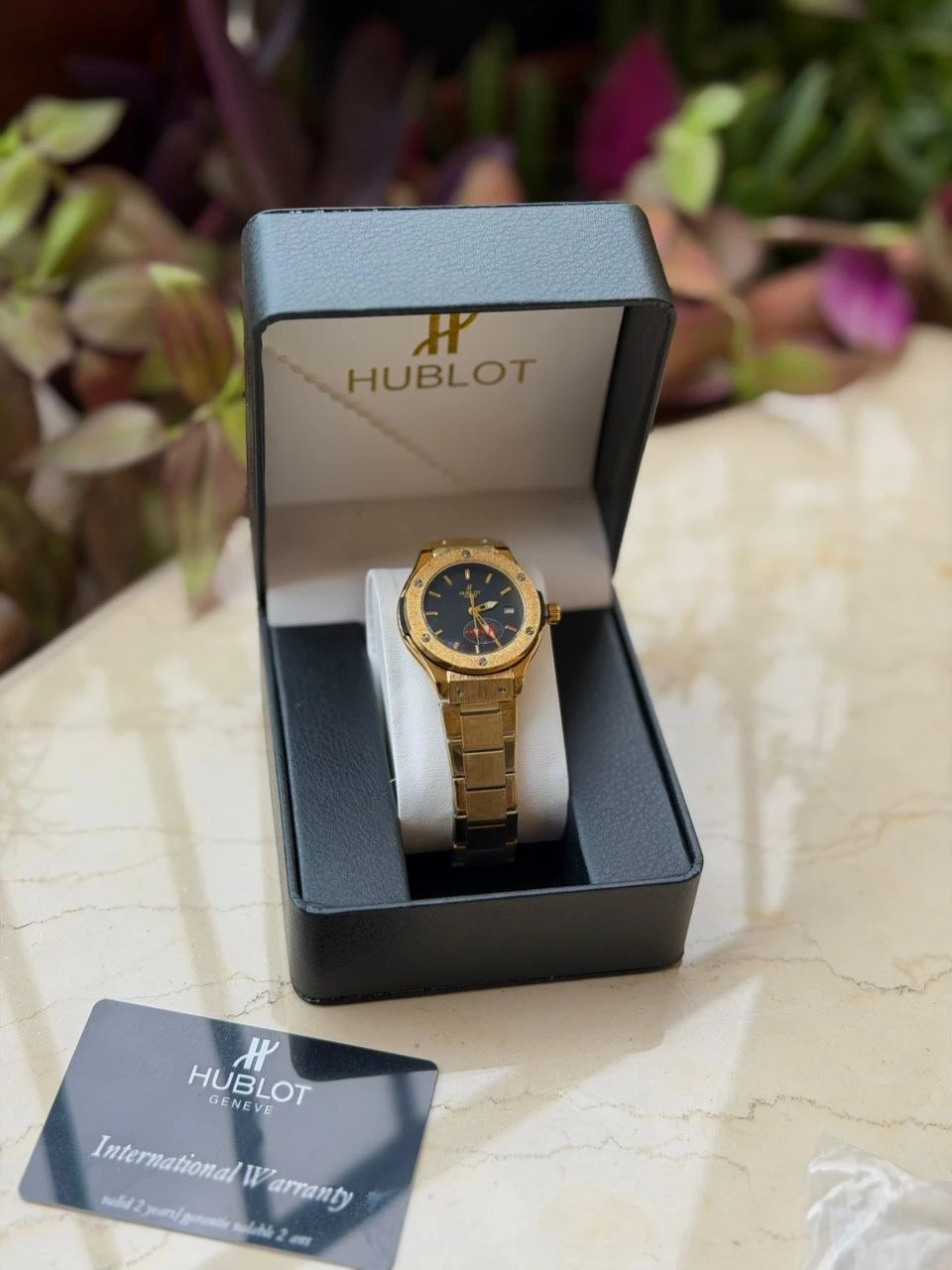 تصميم فاخر: تتميز الساعة بتصميمها الذهبي اللامع الذي يعكس الضوء بشكل رائع، مما يضفي لمسة من الأناقة والجاذبية.